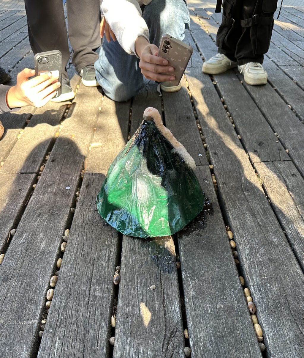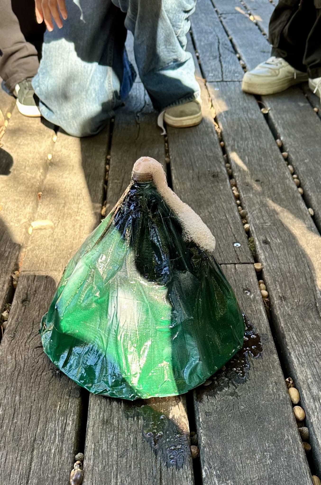 Im GeWi-Unterricht beschäftigten sich die Schüler des 7. Jahrgangs (M3b) mit Naturkatastrophen. Zur Veranschaulichung bauten sie in diesem Zusammenhang auch diesen Vulkan, der schließlich auf dem Schulhof eindrucksvoll „ausbrach“.