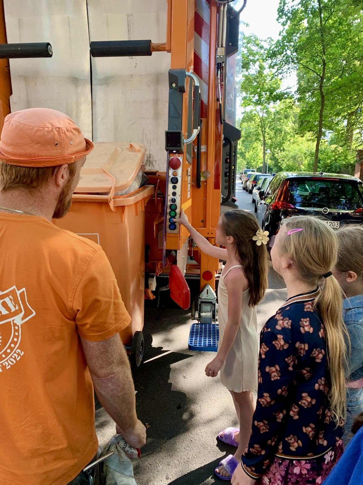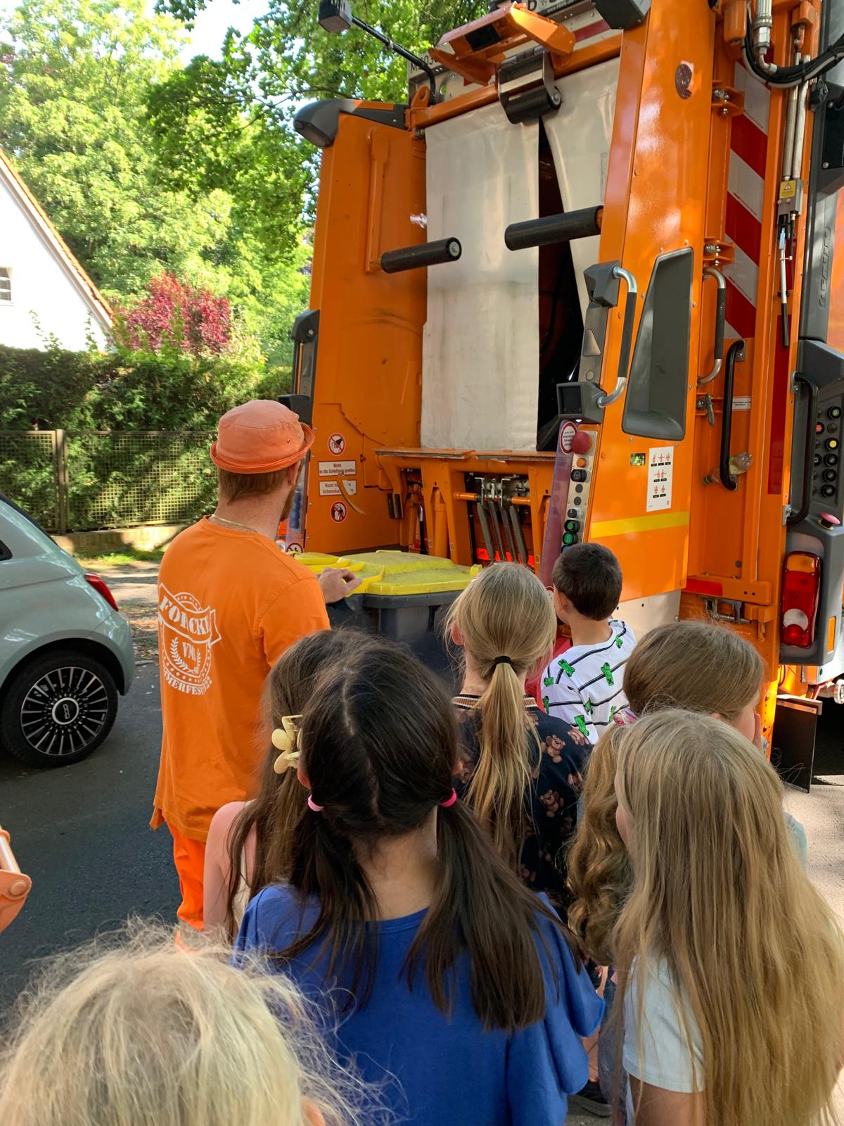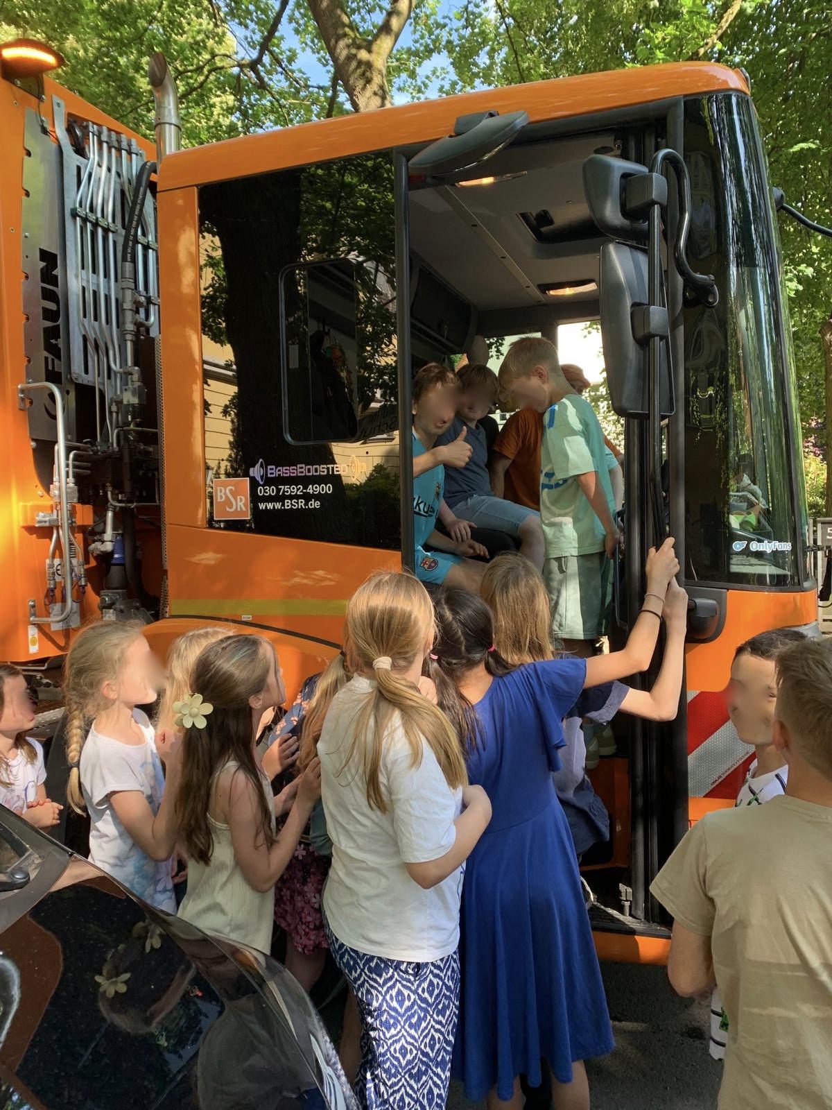 Im Sommer traf die U3/4 in der Holbeinstraße die freundlichen Männer von der BSR. Die zeigten den Schülerinnen und Schüler spontan, wie ihr großer Wagen funktioniert. Eine Begegnung, die ideal zum Projekt „Nachhaltigkeit“ passte, die gerade auf dem Stundenplan der Klasse stand.