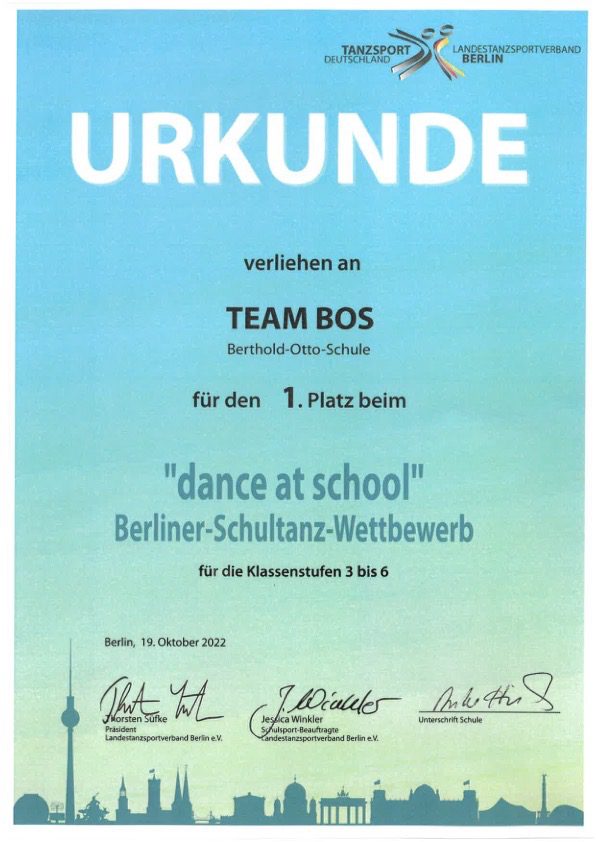 Vorläufiger Höhepunkt war der Gewinn des Berliner Schultanz-Wettbewerbs im Oktober 2022. Unter der Leitung von Frau Wollesen gewann die Tanz-AG der BOS vor den Tanzgruppen der anderen teilnehmenden Berliner Schulen.