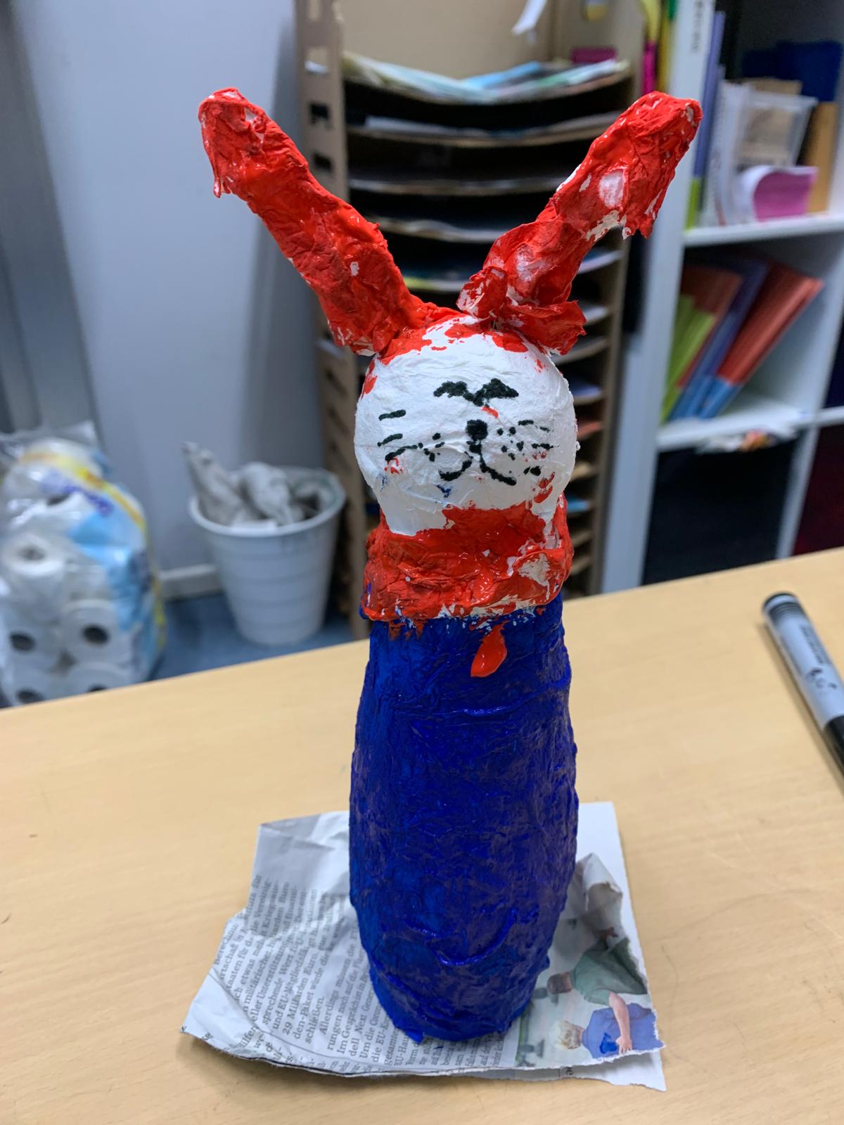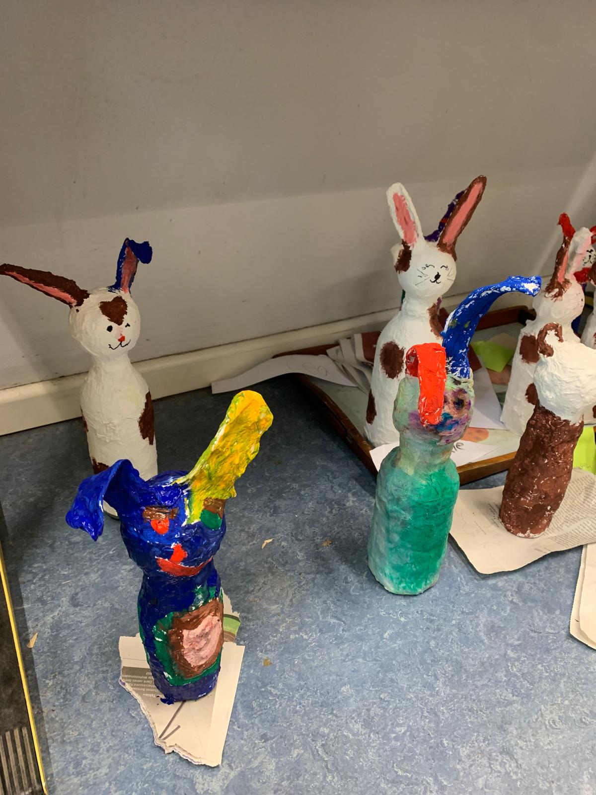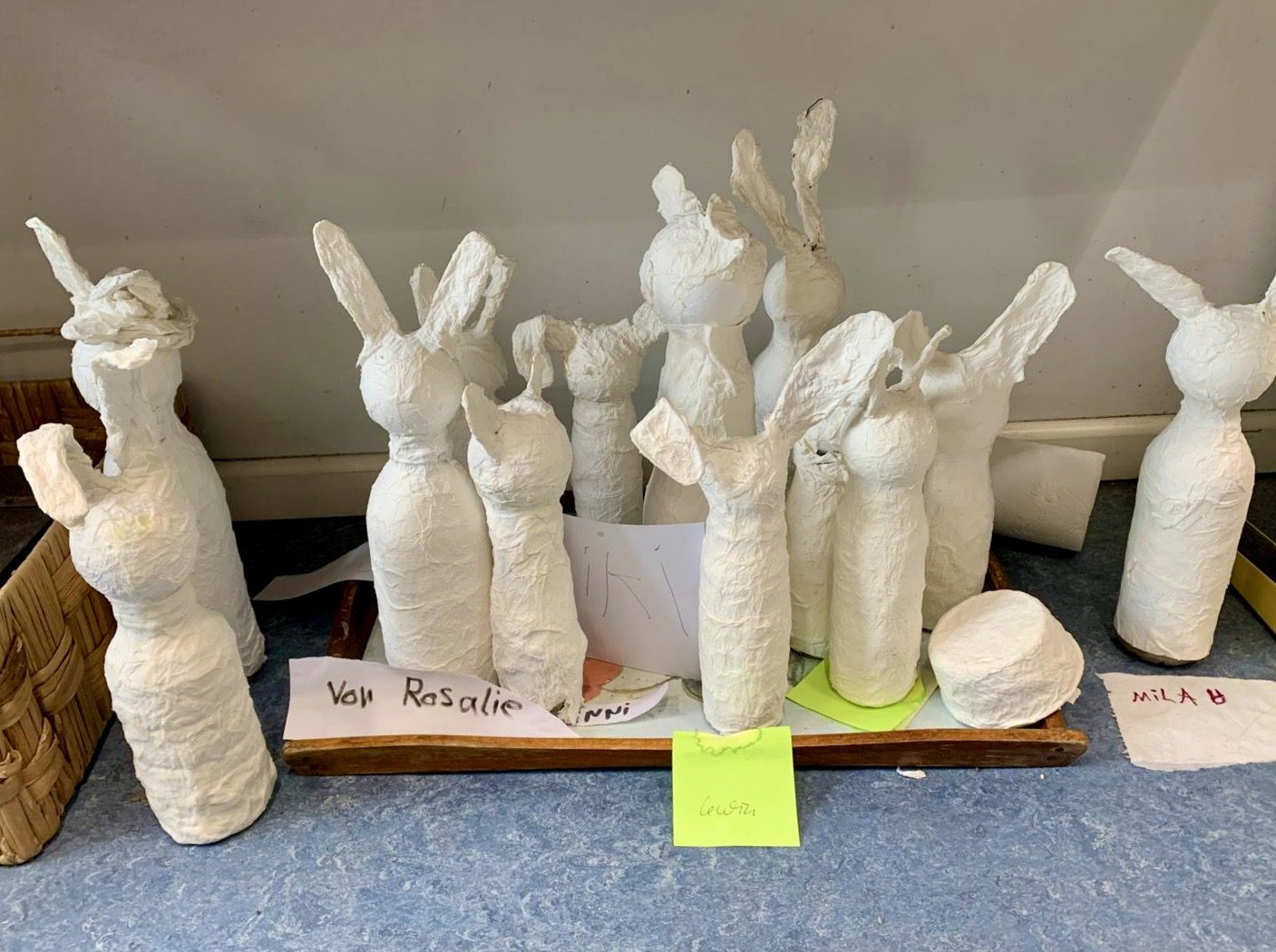 Rechtzeitig zum Osterfest schufen die Schülerinnen und Schüler U 3/4 im Kunstunterricht diese lustigen Osterhasen. Es wurde fleißig geformt und gemalt, das gibt zur Belohnung bestimmt besonders große Ostereier vom Vorbild dieser Kunstwerke.